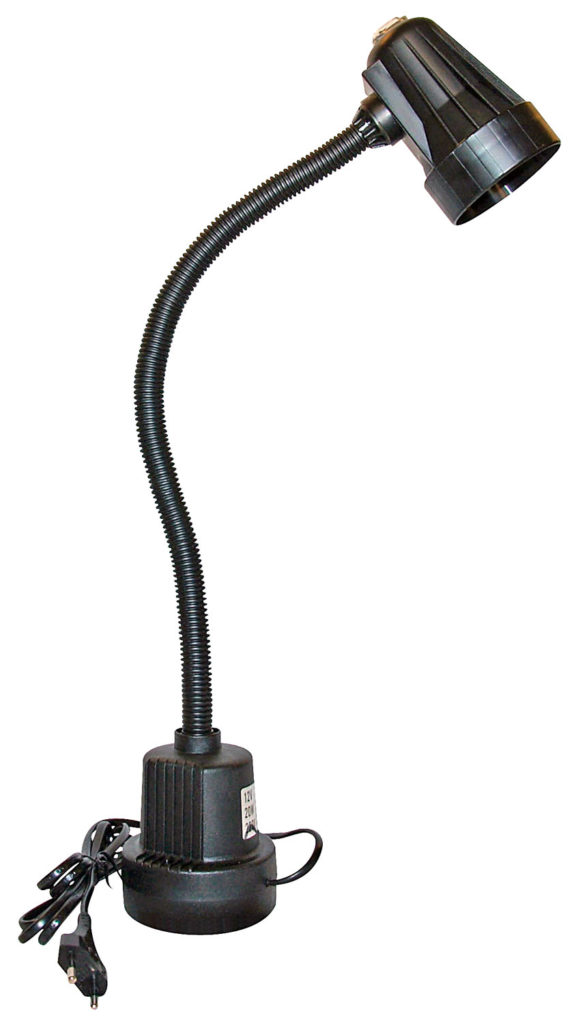 G601. Belysning för maskinskydd med lamphuvud i slagtålig hårdplast och inbyggd magnetfot. Utrustad med flexibel arm, längd 500 mm. Transformatorns effekt: 230V/12V/20W.