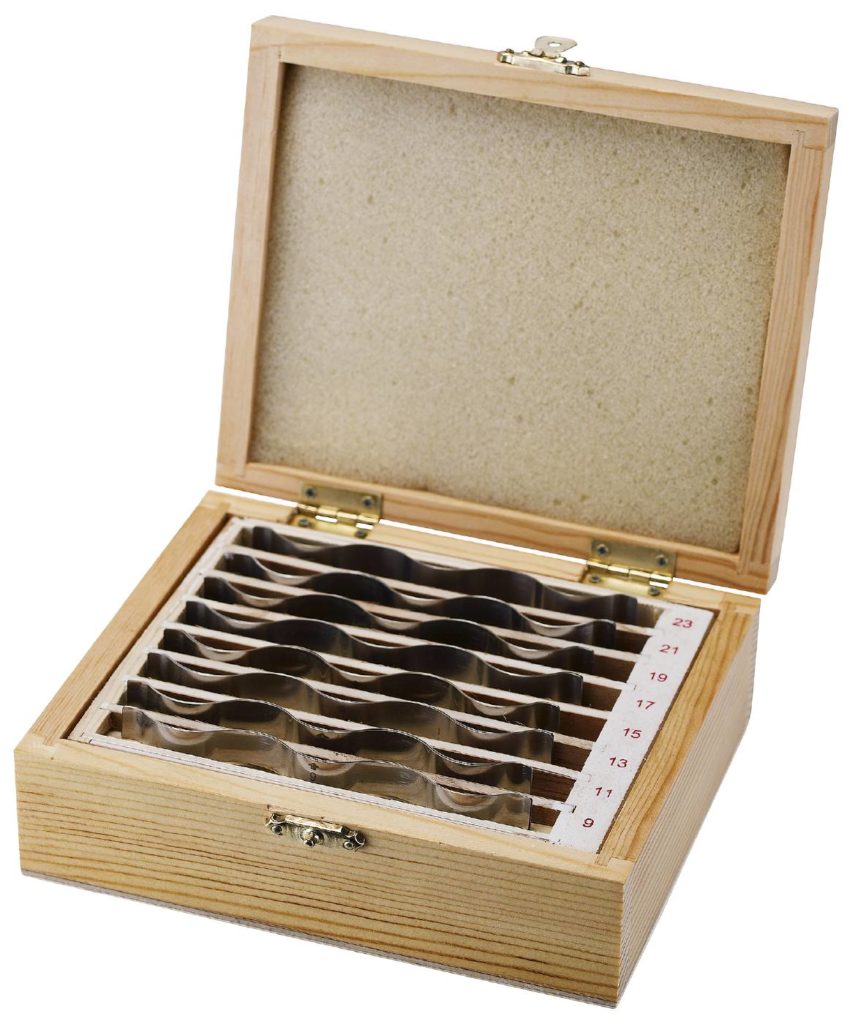 Av härdat och slipat fjäderstål. Vågformiga parallellbitar (tjocklek 0.3 mm) som